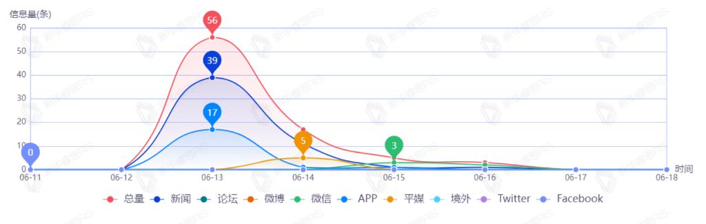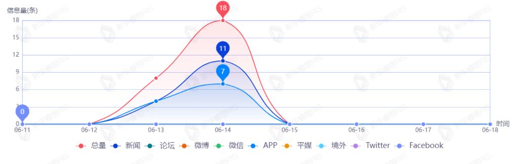 截至目前,該文章在互聯(lián)網(wǎng)上傳播總量26篇。其中6月14日是傳播的高峰期,共傳播18篇文章。各信源的信息發(fā)布情況中,新聞信息占比最大,其次是APP,占比分別為57.69%、42.31%。(數(shù)據(jù)來(lái)源:新華睿思數(shù)據(jù)云圖分析平臺(tái))