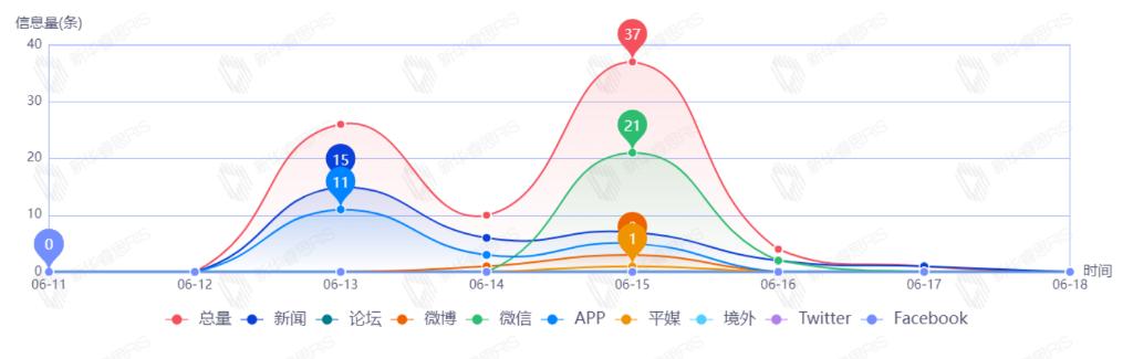 截至目前,該文章在互聯(lián)網(wǎng)上傳播總量78篇。其中6月15日是傳播的高峰期,共傳播37篇文章。各信源的信息發(fā)布情況中,新聞信息占比最大,其次是微信和APP,占比分別為39.74%、29.49%、24.36%。(數(shù)據(jù)來(lái)源:新華睿思數(shù)據(jù)云圖分析平臺(tái))