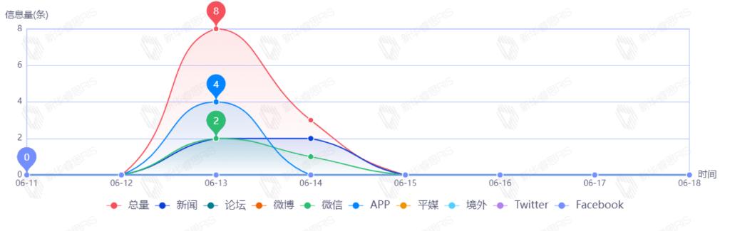 截至目前,該文章在互聯(lián)網(wǎng)上傳播總量11篇。其中6月13日是傳播的高峰期,共傳播8篇文章。各信源的信息發(fā)布情況中,新聞信息占比最大,其次是APP和微信,占比分別為36.36%、36.36%、27.27%。(數(shù)據(jù)來(lái)源:新華睿思數(shù)據(jù)云圖分析平臺(tái))