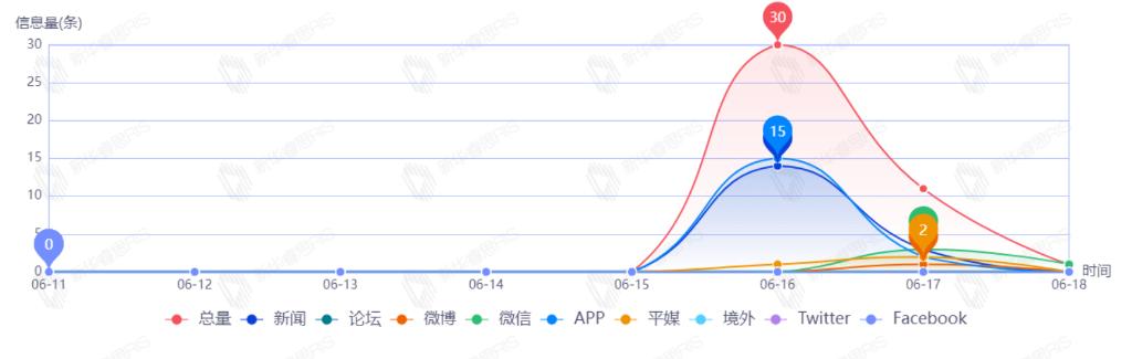 截至目前,該文章在互聯(lián)網(wǎng)上傳播總量42篇。其中6月16日是傳播的高峰期,共傳播30篇文章。各信源的信息發(fā)布情況中,新聞信息占比最大,其次是APP和微信,占比分別為40.48%、40.48%、9.52%。(數(shù)據(jù)來(lái)源:新華睿思數(shù)據(jù)云圖分析平臺(tái))