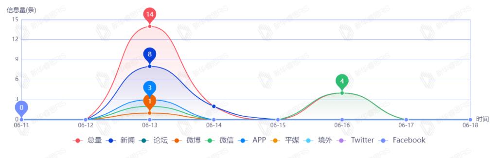 截至目前,該文章在互聯(lián)網(wǎng)上傳播總量20篇。其中6月13日是傳播的高峰期,共傳播14篇文章。各信源的信息發(fā)布情況中,新聞信息占比最大,其次是微信和APP,占比分別為50.00%、30.00%、15.00%。(數(shù)據(jù)來(lái)源:新華睿思數(shù)據(jù)云圖分析平臺(tái))
