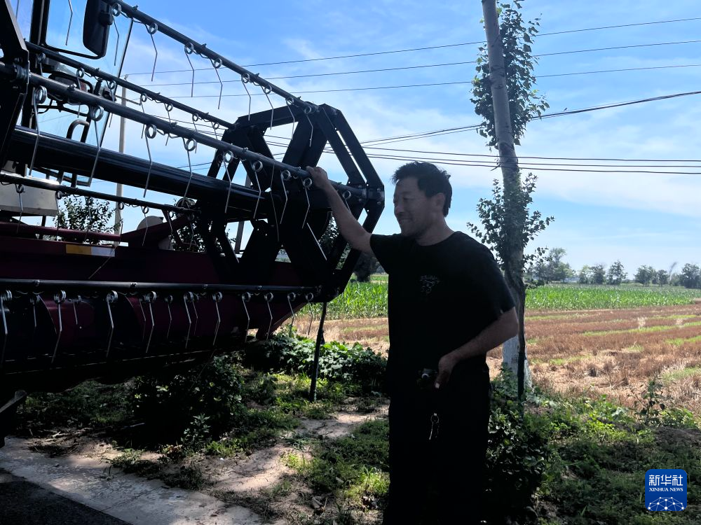 农机手李新荣在检查他的农机。新华社记者 王怡静 摄