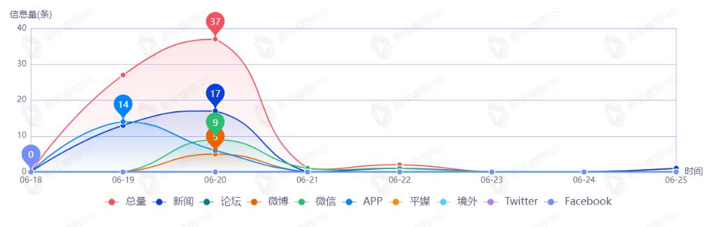 截至目前,該文章在互聯(lián)網(wǎng)上傳播總量共68篇。其中,6月20日是傳播的高峰期,共傳播37篇文章。各信源的信息發(fā)布情況中,新聞信息占比最大,其次是APP和微信,占比分別為47.06%、29.41%、16.18%。(數(shù)據(jù)來源:新華睿思數(shù)據(jù)云圖分析平臺)