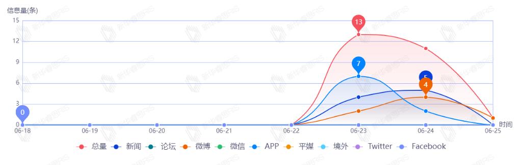 截至目前,該文章在互聯(lián)網(wǎng)上傳播總量共25篇。其中,6月23日是傳播的高峰期,共傳播13篇文章。各信源的信息發(fā)布情況中,新聞信息占比最大,其次是APP和微博,占比分別為36.00%、36.00%、28.00%。(數(shù)據(jù)來源:新華睿思數(shù)據(jù)云圖分析平臺)