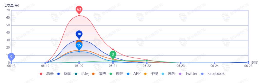截至目前,該文章在互聯(lián)網(wǎng)上傳播總量共86篇。其中,6月20日是傳播的高峰期,共傳播63篇文章。各信源的信息發(fā)布情況中,新聞信息占比最大,其次是微博和APP,占比分別為45.98%、26.44%、19.54%。(數(shù)據(jù)來源:新華睿思數(shù)據(jù)云圖分析平臺)