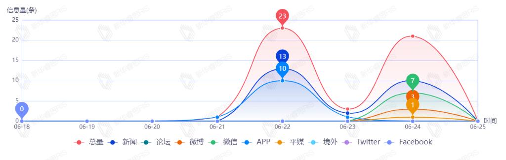 截至目前,該文章在互聯(lián)網(wǎng)上傳播總量共48篇。其中,6月22日是傳播的高峰期,共傳播23篇文章。各信源的信息發(fā)布情況中,新聞信息占比最大,其次是APP和微信,占比分別為52.08%、25.00%、14.58%。(數(shù)據(jù)來源:新華睿思數(shù)據(jù)云圖分析平臺)