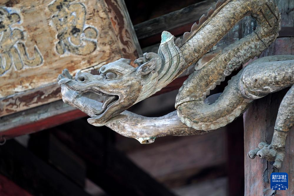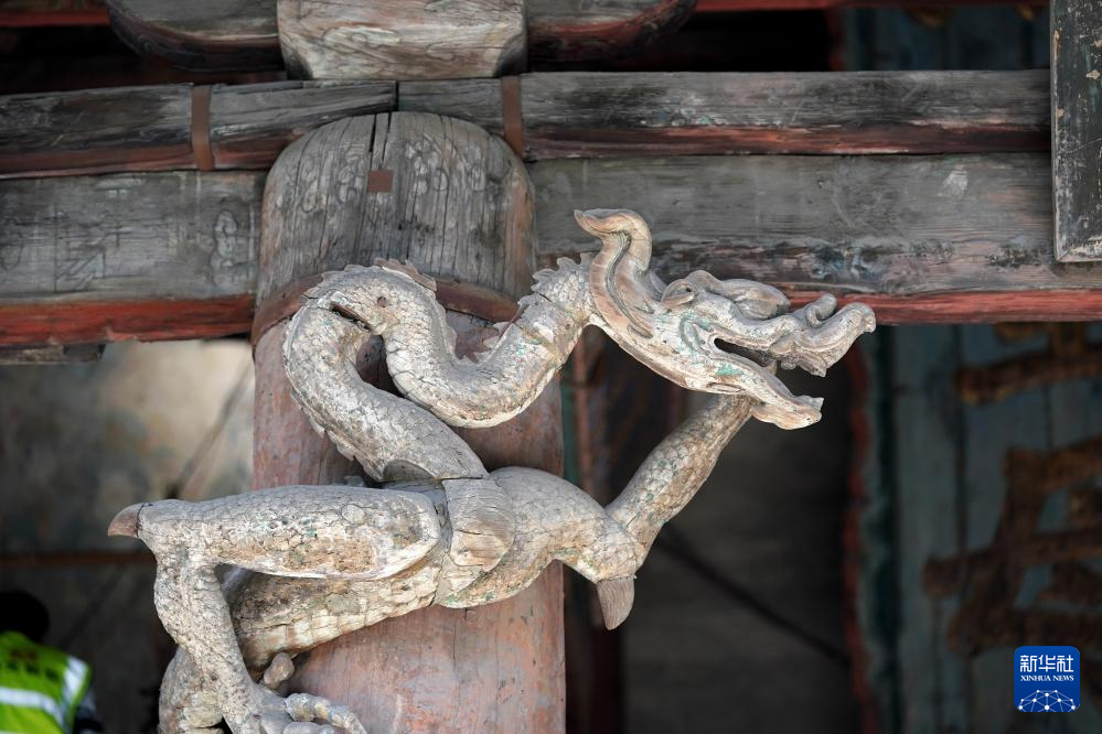晋祠圣母殿的建筑构件(7月4日摄)。