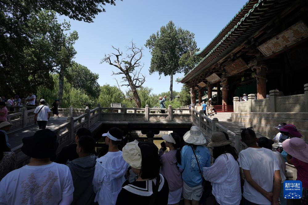 游客在晋祠圣母殿前观看十字形古桥鱼沼飞梁(7月4日摄)。