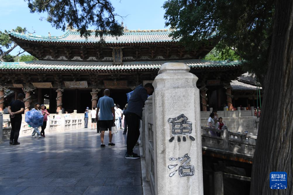 游客参观晋祠圣母殿和殿前的十字形古桥鱼沼飞梁(7月4日摄)。