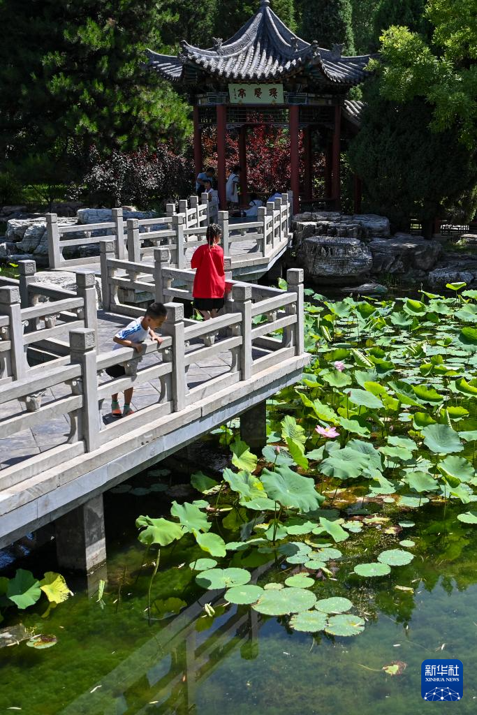 小朋友在晋祠中观赏荷花(7月4日摄)。