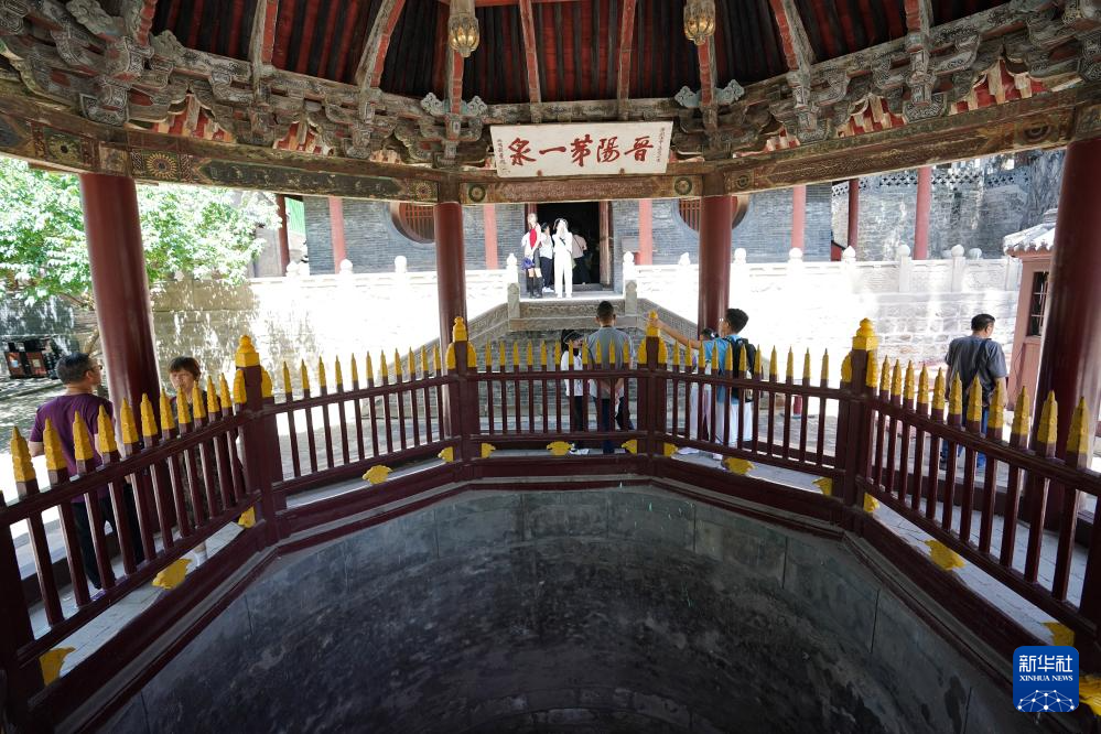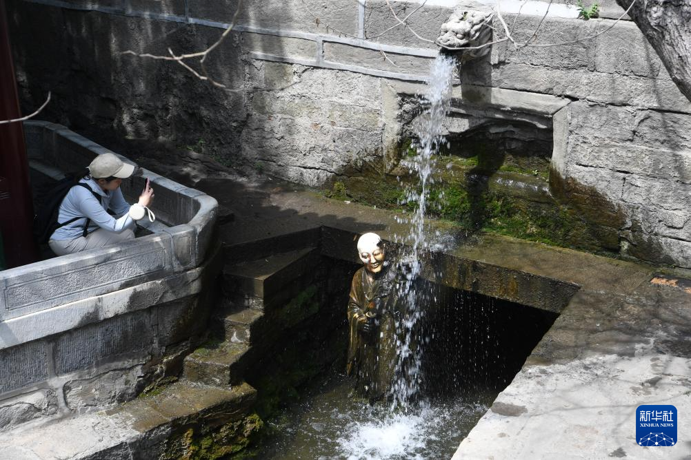 游客在晋祠难老泉旁的出水口拍照(6月16日摄)。