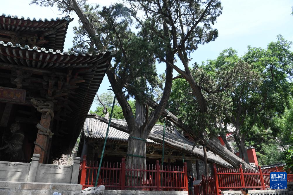 晋祠圣母殿旁树龄3000多年的周柏(6月16日摄)。