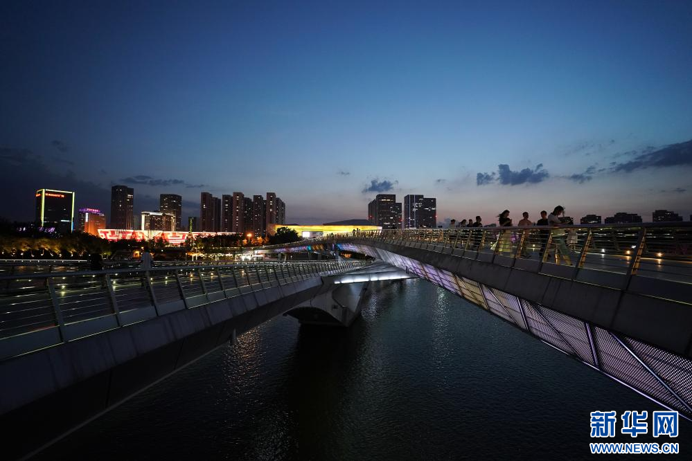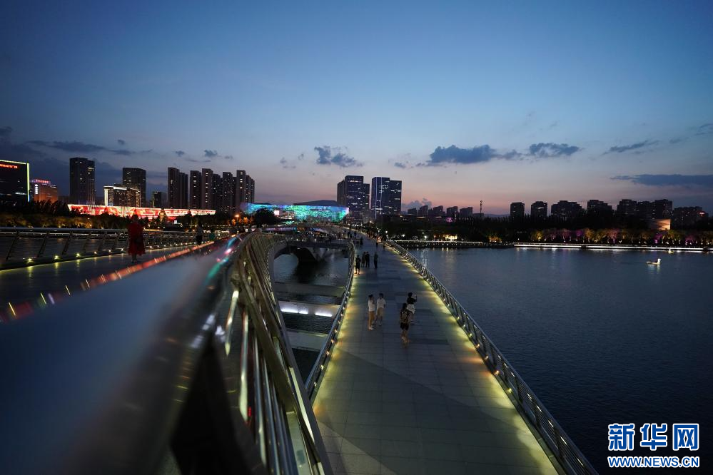 太原市汾河景区灯光璀璨(7月25日摄)。