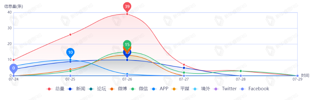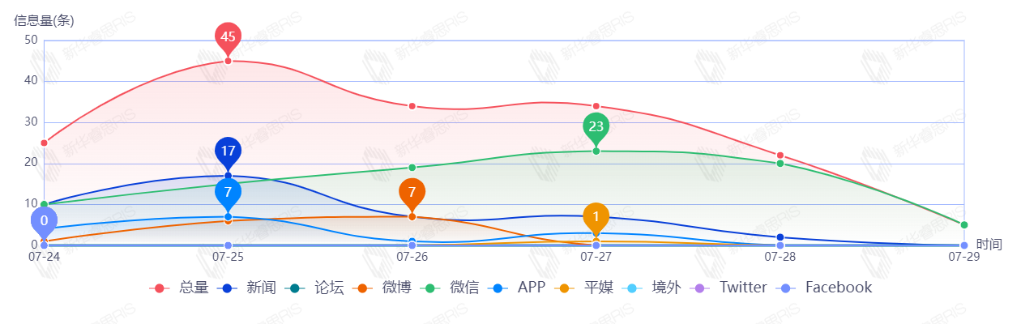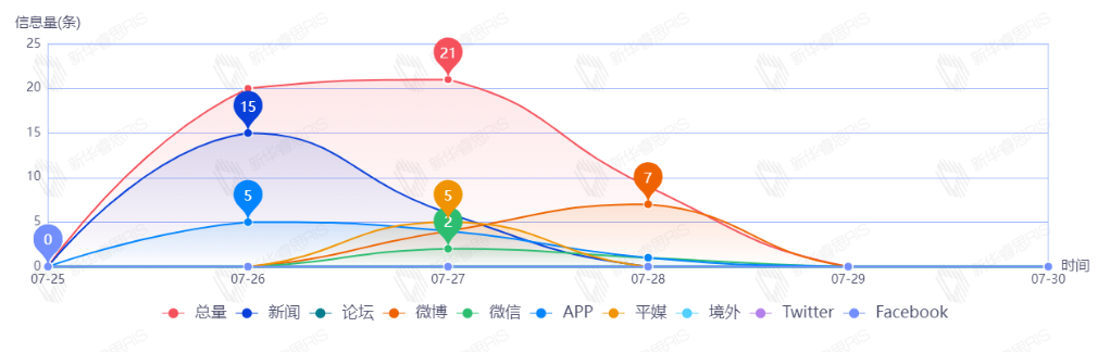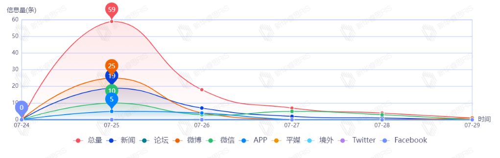 截至目前,該文章在互聯(lián)網(wǎng)上傳播總量共89篇。其中,7月25日是傳播的高峰期,共傳播59篇文章。各信源的信息發(fā)布情況中,微博占比最大,其次是新聞信息,占比分別為33.71%和32.58%。(數(shù)據(jù)來源:新華睿思數(shù)據(jù)云圖分析平臺(tái))
