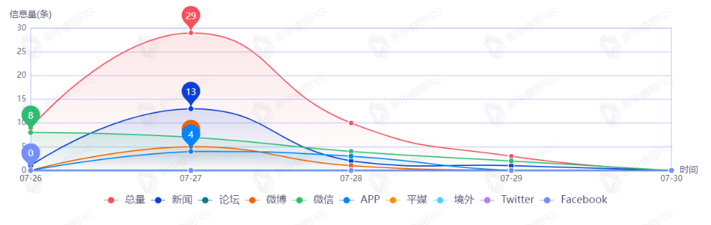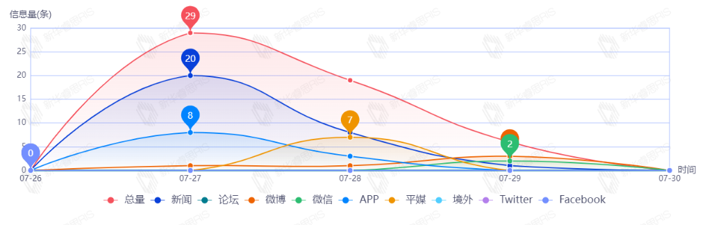 截至目前,該文章在互聯(lián)網(wǎng)上傳播總量共54篇。其中,7月27日是傳播的高峰期,共傳播29篇文章。各信源的信息發(fā)布情況中,新聞信息占比最大,其次是APP,占比分別為53.70%和20.37%。(數(shù)據(jù)來源:新華睿思數(shù)據(jù)云圖分析平臺(tái))