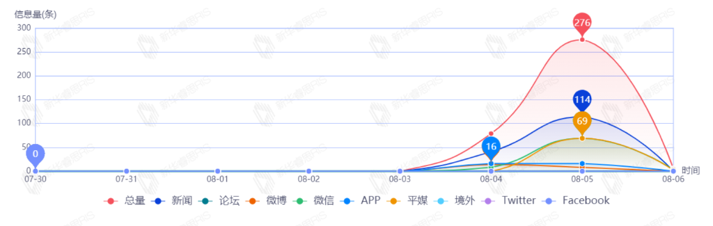 截至目前,該文章在互聯(lián)網(wǎng)上傳播總量共360篇。其中,8月5日是傳播的高峰期,共傳播276篇文章。各信源的信息發(fā)布情況中,新聞信息占比最大,其次是微信和平媒,占比分別為43.06%、22.22%、19.72%。(數(shù)據(jù)來源:新華睿思·數(shù)媒智慧分析平臺)