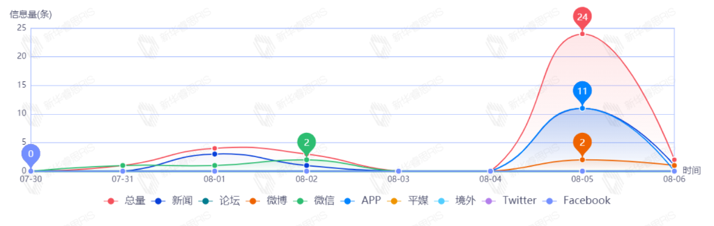 截至目前,該文章在互聯(lián)網(wǎng)上傳播總量共34篇。其中,8月5日是傳播的高峰期,共傳播24篇文章。各信源的信息發(fā)布情況中,新聞信息占比最大,其次是APP和微信,占比分別為47.06%、32.35%、11.76%。(數(shù)據(jù)來源:新華睿思·數(shù)媒智慧分析平臺)