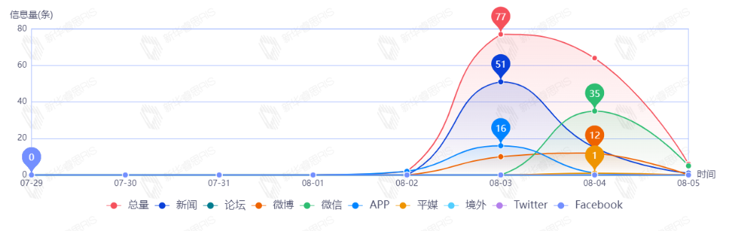 截至目前,該文章在互聯(lián)網(wǎng)上傳播總量共149篇。其中,8月3日是傳播的高峰期,共傳播77篇文章。各信源的信息發(fā)布情況中,新聞信息占比最大,其次是微信和微博,占比分別為44.97%、26.85%、14.77%。(數(shù)據(jù)來源:新華睿思·數(shù)媒智慧分析平臺)