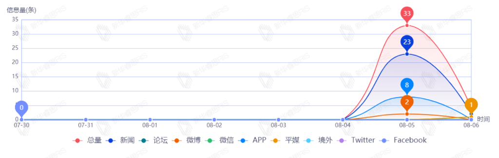截至目前,該文章在互聯(lián)網(wǎng)上傳播總量共37篇。其中,8月5日是傳播的高峰期,共傳播33篇文章。各信源的信息發(fā)布情況中,新聞信息占比最大,其次是APP和微博,占比分別為67.57%、21.62%、5.41%。(數(shù)據(jù)來源:新華睿思·數(shù)媒智慧分析平臺)