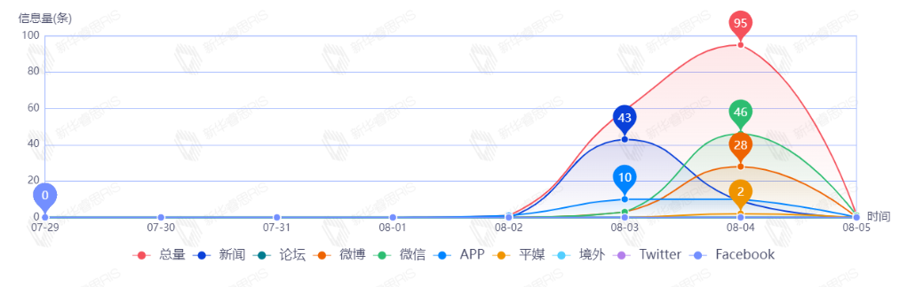 截至目前,該文章在互聯(lián)網(wǎng)上傳播總量共156篇。其中,8月4日是傳播的高峰期,共傳播95篇文章。各信源的信息發(fā)布情況中,新聞信息占比最大,其次是微信和微博,占比分別為33.33%、32.05%、19.87%。(數(shù)據(jù)來源:新華睿思·數(shù)媒智慧分析平臺)