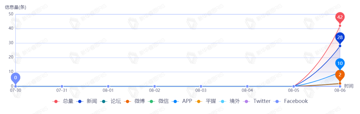 截至目前,該文章在互聯(lián)網(wǎng)上傳播總量共42篇。其中,8月6日是傳播的高峰期,共傳播42篇文章。各信源的信息發(fā)布情況中,新聞信息占比最大,其次是APP和論壇占比分別為66.67%、23.81%、4.76%。(數(shù)據(jù)來源:新華睿思·數(shù)媒智慧分析平臺)