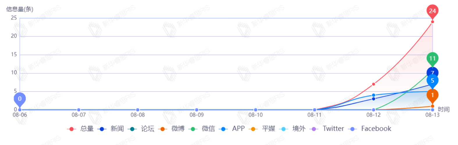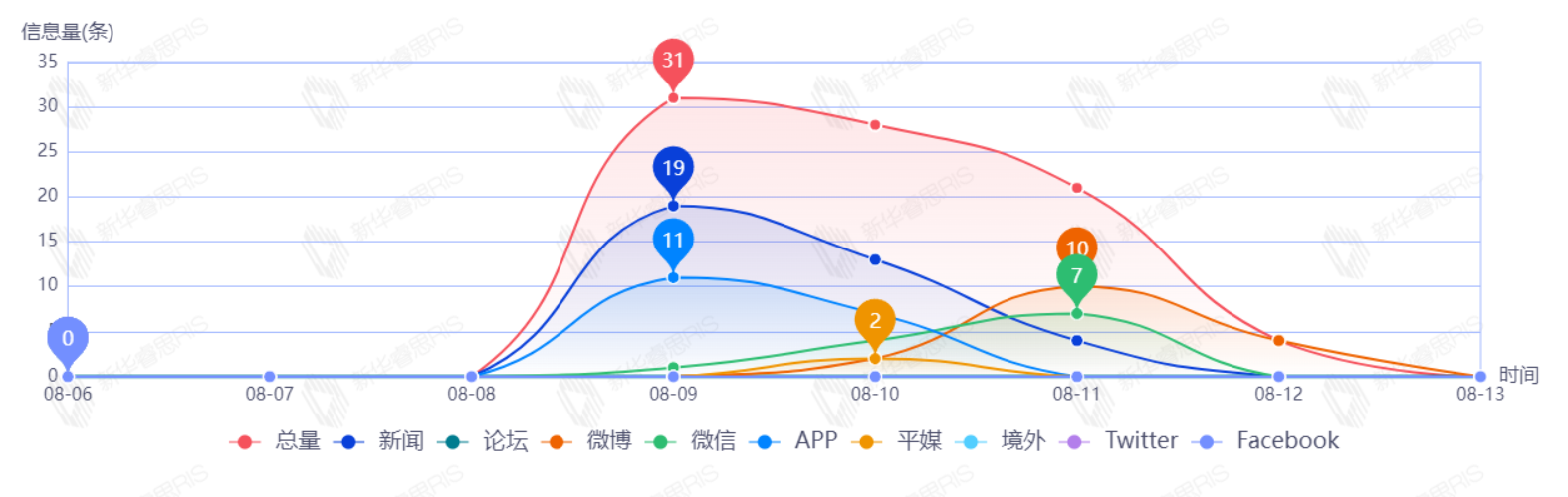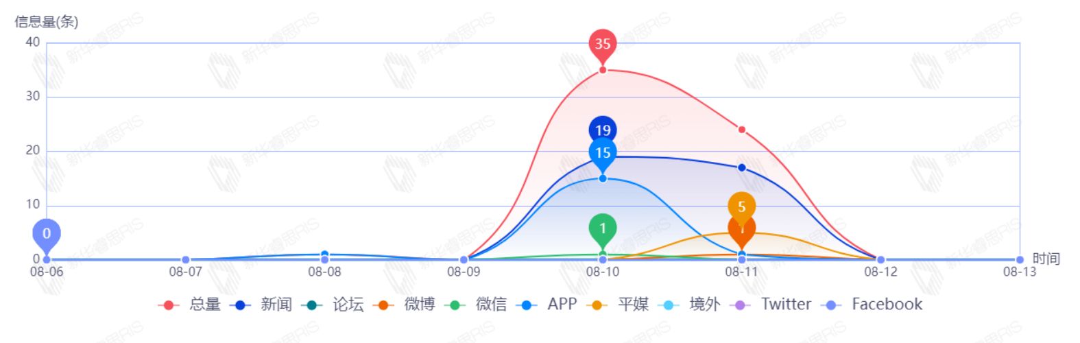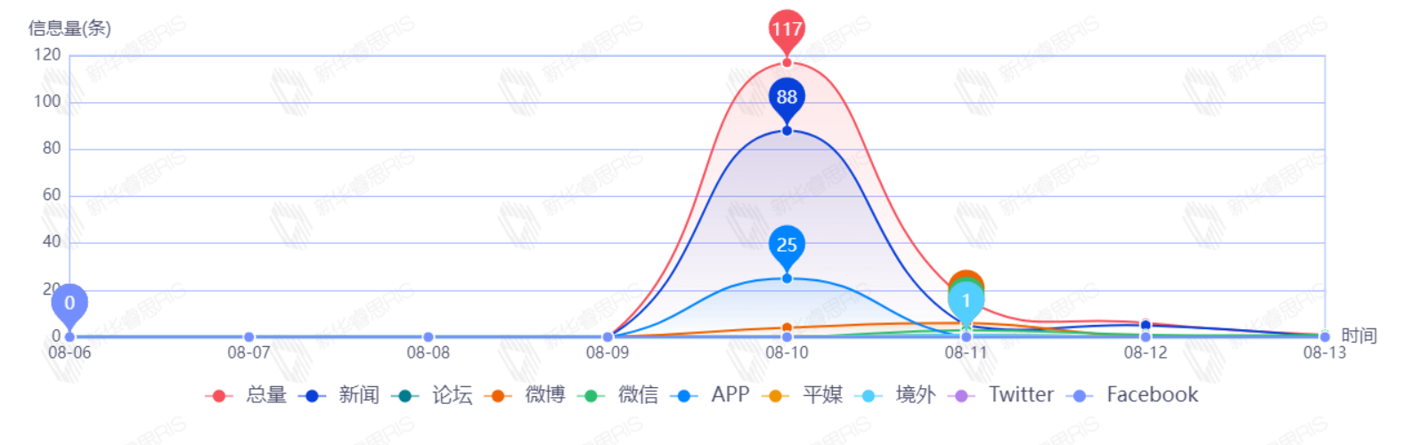 截至目前,該文章在互聯(lián)網上傳播總量140篇。其中8月10日是傳播的高峰期,共傳播117篇文章。各信源的信息發(fā)布情況中,新聞信息占比最大,其次是APP和微博,占比分別為70.00%、17.86%、7.14%。(數(shù)據(jù)來源:新華睿思數(shù)據(jù)云圖分析平臺)