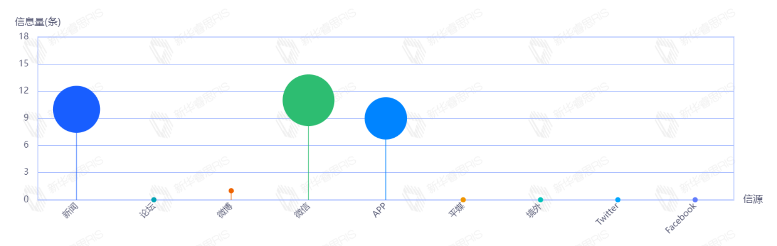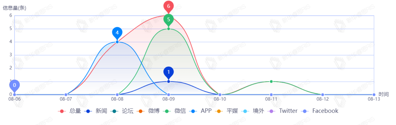 截至目前,該文章在互聯(lián)網上傳播總量11篇。其中8月9日是傳播的高峰期,共傳播6篇文章。各信源的信息發(fā)布情況中,微信信息占比最大,其次是APP和新聞,占比分別為54.55%、36.36%、9.09%。(數(shù)據(jù)來源:新華睿思數(shù)據(jù)云圖分析平臺)