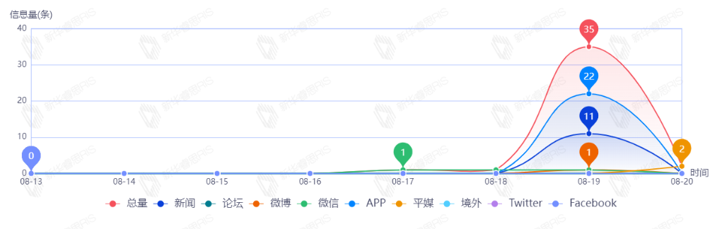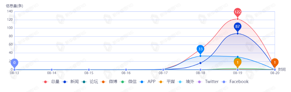 截至目前,該文章在互聯(lián)網(wǎng)上傳播總量175篇。其中8月19日是傳播的高峰期,共傳播122篇文章。各信源的信息發(fā)布情況中,新聞信息占比最大,其次是APP和微信,占比分別為60.00%、37.14%、1.71%。(數(shù)據(jù)來源:新華睿思數(shù)據(jù)云圖分析平臺)