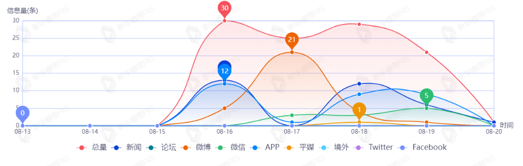 截至目前,該文章在互聯(lián)網(wǎng)上傳播總量106篇。其中8月16日是傳播的高峰期,共傳播30篇文章。各信源的信息發(fā)布情況中,新聞信息占比最大,其次是微博和APP,占比分別為30.19%、29.25%、29.25%。(數(shù)據(jù)來源:新華睿思數(shù)據(jù)云圖分析平臺)