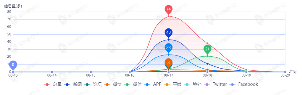 截至目前,該文章在互聯(lián)網(wǎng)上傳播總量115篇。其中8月17日是傳播的高峰期,共傳播74篇文章。各信源的信息發(fā)布情況中,新聞信息占比最大,其次是微信和APP,占比分別為47.83%、22.61%、22.61%。(數(shù)據(jù)來源:新華睿思數(shù)據(jù)云圖分析平臺)