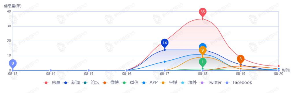 截至目前,該文章在互聯(lián)網(wǎng)上傳播總量67篇。其中8月18日是傳播的高峰期,共傳播35篇文章。各信源的信息發(fā)布情況中,新聞信息占比最大,其次是APP和平媒,占比分別為47.76%、28.36%、14.93%。(數(shù)據(jù)來源:新華睿思數(shù)據(jù)云圖分析平臺)