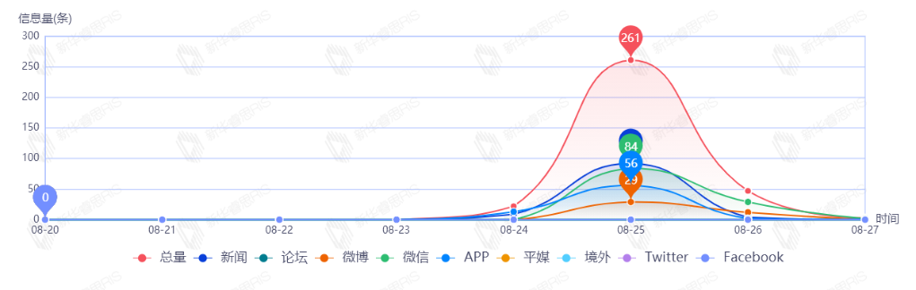 截至目前,該文章在互聯(lián)網(wǎng)上傳播總量333篇。其中8月25日是傳播的高峰期,共傳播261篇文章。各信源的信息發(fā)布情況中,微信信息占比最大,其次是新聞和APP,占比分別為34.53%、31.53%、21.62%。(數(shù)據(jù)來源:新華睿思數(shù)據(jù)云圖分析平臺)