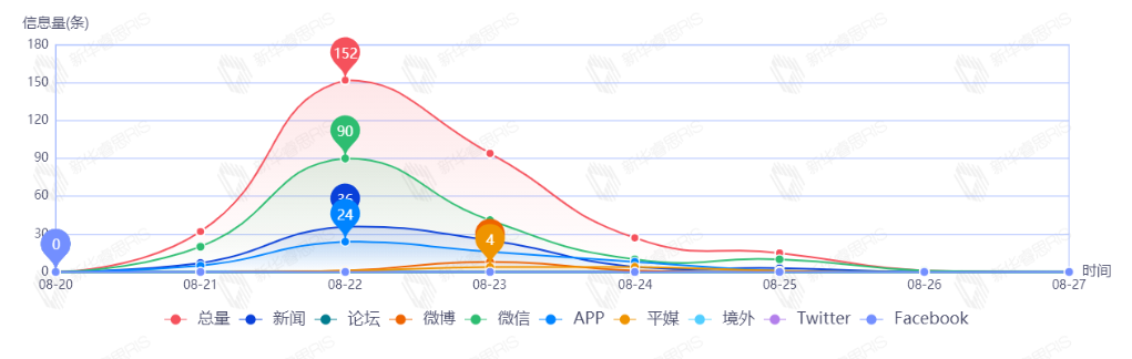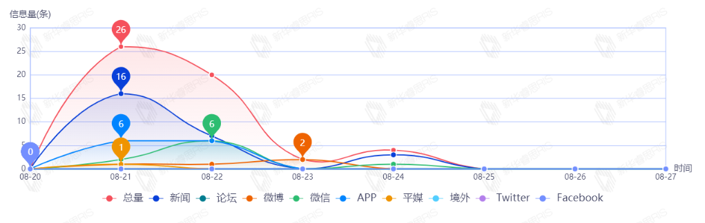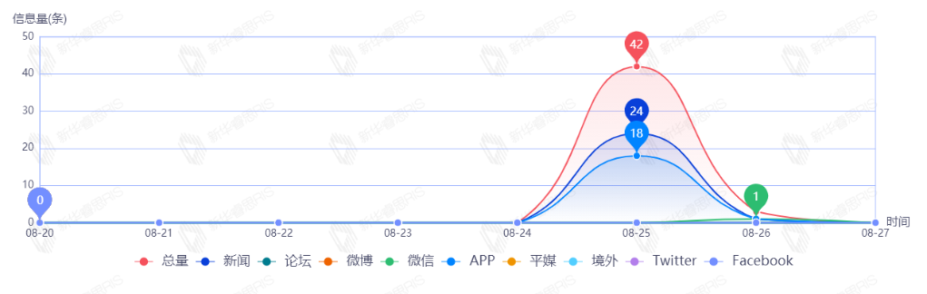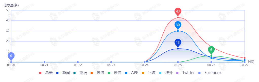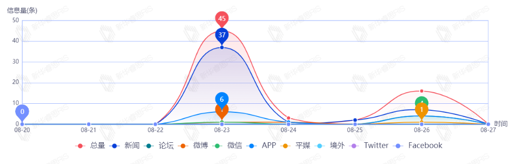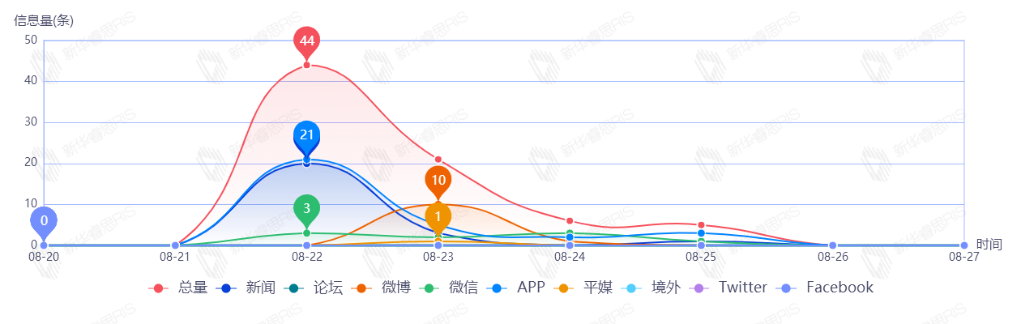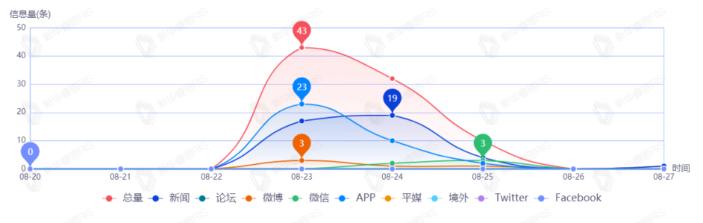 截至目前,該文章在互聯(lián)網(wǎng)上傳播總量86篇。其中8月23日是傳播的高峰期,共傳播43篇文章。各信源的信息發(fā)布情況中,新聞信息占比最大,其次是APP和微信,占比分別為47.67%、40.70%、5.81%。(數(shù)據(jù)來源:新華睿思數(shù)據(jù)云圖分析平臺)