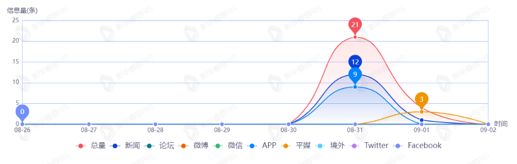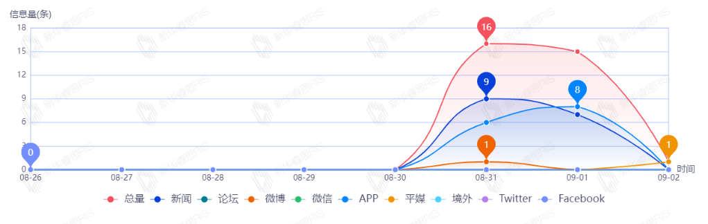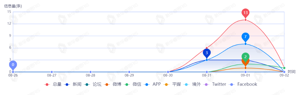 截至目前,該文章在互聯(lián)網(wǎng)上傳播總量共20篇。其中,9月1日是傳播的高峰期,共傳播13篇文章。各信源的信息發(fā)布情況中,APP信息占比最大,其次是新聞和微信,占比分別為50.00%、30.00%、15.00%。(數(shù)據(jù)來源:新華睿思·數(shù)媒智慧分析平臺)