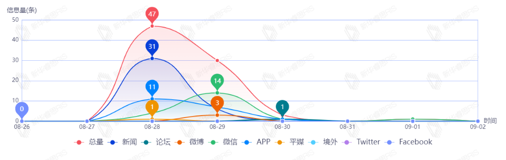 截至目前,該文章在互聯(lián)網(wǎng)上傳播總量共81篇。其中,8月28日是傳播的高峰期,共傳播47篇文章。各信源的信息發(fā)布情況中,新聞信息占比最大,其次是微信和APP,占比分別為45.68%、24.69%、23.46%。(數(shù)據(jù)來源:新華睿思·數(shù)媒智慧分析平臺)