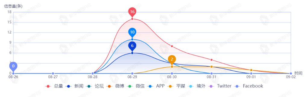 截至目前,該文章在互聯(lián)網(wǎng)上傳播總量共29篇。其中,8月29日是傳播的高峰期,共傳播16篇文章。各信源的信息發(fā)布情況中,APP信息占比最大,其次是新聞和平媒,占比分別為44.83%、37.93%、17.24%。(數(shù)據(jù)來源:新華睿思·數(shù)媒智慧分析平臺)