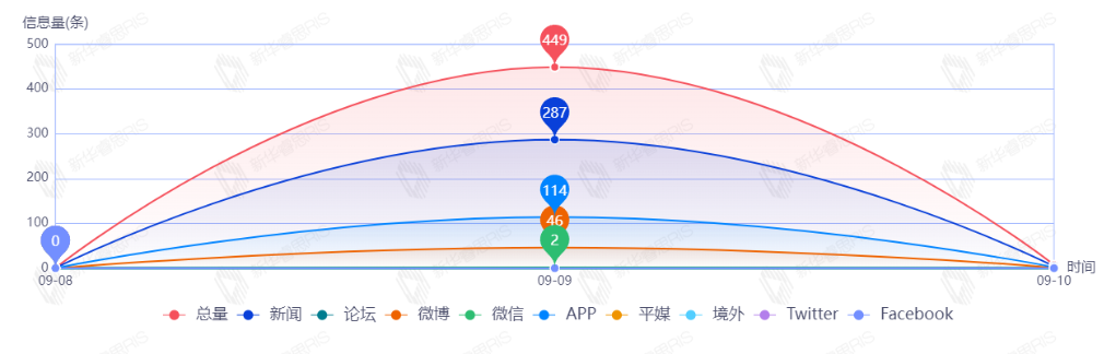 截至目前,該文章在互聯(lián)網(wǎng)上傳播總量共456篇。其中,9月9日是傳播的高峰期,共傳播449篇文章。各信源的信息發(fā)布情況中,新聞信息占比最大,其次是APP和微博,占比分別為63.82%、25.44%和10.31%。(數(shù)據(jù)來源:新華睿思·數(shù)媒智慧分析平臺)