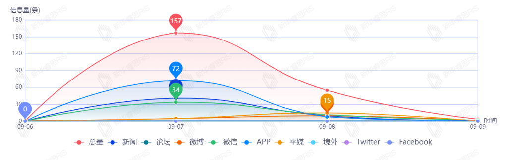 截至目前,該文章在互聯(lián)網(wǎng)上傳播總量共216篇。其中,9月7日是傳播的高峰期,共傳播157篇文章。各信源的信息發(fā)布情況中,APP占比最大,其次是新聞和微信,占比分別為37.04%、24.07%、22.22%。(數(shù)據(jù)來源:新華睿思·數(shù)媒智慧分析平臺)