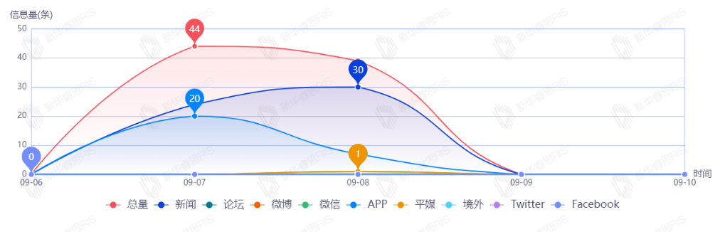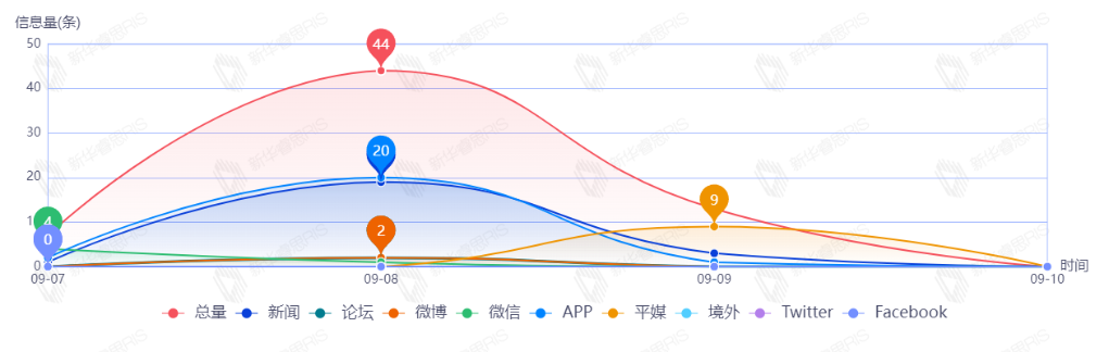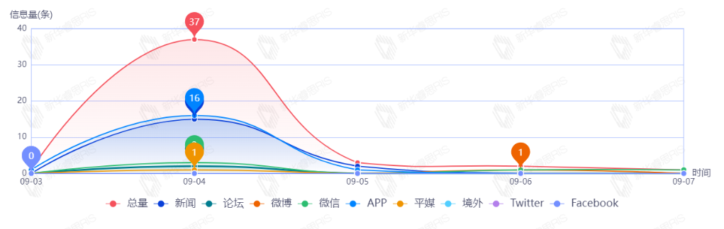 截至目前,該文章在互聯(lián)網(wǎng)上傳播總量共44篇。其中,9月4日是傳播的高峰期,共傳播37篇文章。各信源的信息發(fā)布情況中,APP占比最大,其次是新聞信息,占比分別為40.91%、38.64%。(數(shù)據(jù)來源:新華睿思·數(shù)媒智慧分析平臺)