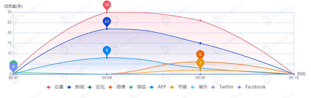 截至目前,該文章在互聯(lián)網(wǎng)上傳播總量共57篇。其中,9月8日是傳播的高峰期,共傳播30篇文章。各信源的信息發(fā)布情況中,新聞信息占比最大,其次是APP,占比分別為64.91%、19.30%。(數(shù)據(jù)來源:新華睿思·數(shù)媒智慧分析平臺)