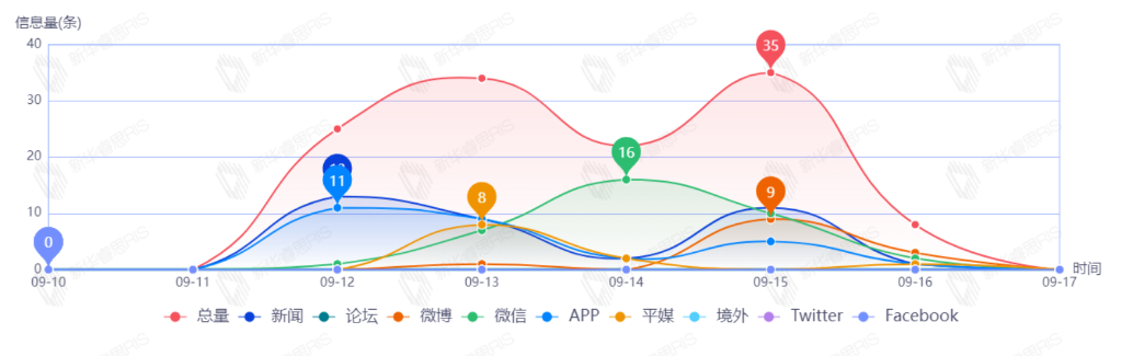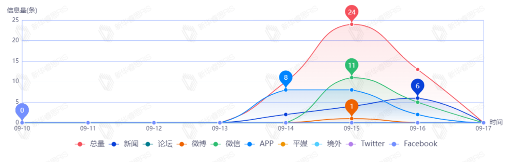 截至目前,該文章在互聯(lián)網(wǎng)上傳播總量124篇。其中9月15日是傳播的高峰期,共傳播35篇文章。各信源的信息發(fā)布情況中,新聞信息占比最大,其次是微信和APP,占比分別為29.03%、29.03%、22.58%。(數(shù)據(jù)來源:新華睿思數(shù)據(jù)云圖分析平臺)