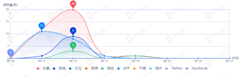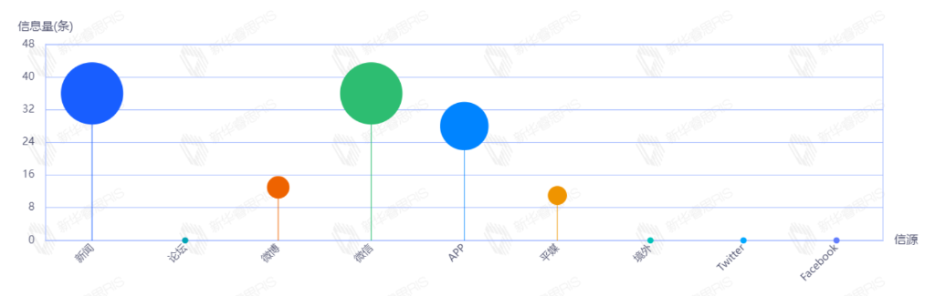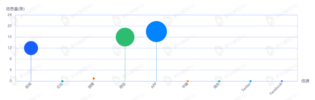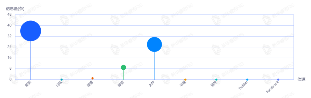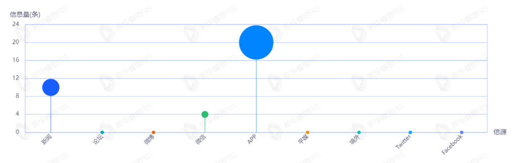 截至目前,該文章在互聯(lián)網(wǎng)上傳播總量34篇。其中9月12日是傳播的高峰期,共傳播20篇文章。各信源的信息發(fā)布情況中,APP信息占比最大,其次是新聞和微信,占比分別為58.82%、29.41%、11.76%。(數(shù)據(jù)來源:新華睿思數(shù)據(jù)云圖分析平臺)