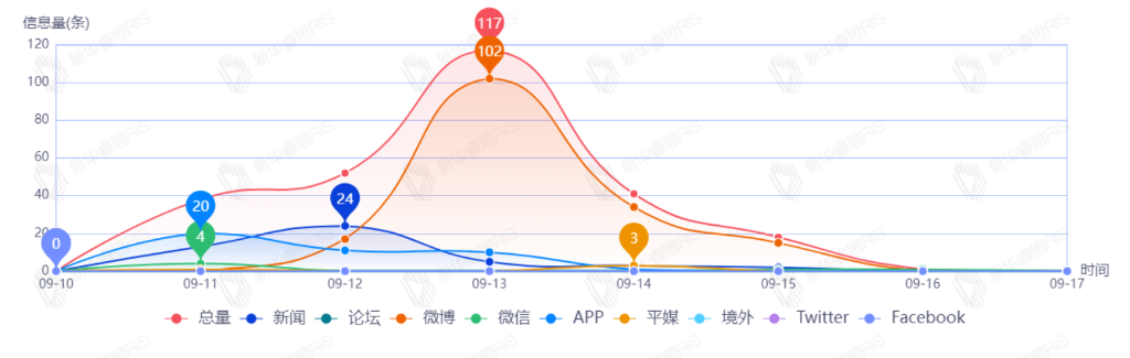 截至目前,該文章在互聯(lián)網(wǎng)上傳播總量267篇。其中9月13日是傳播的高峰期,共傳播117篇文章。各信源的信息發(fā)布情況中,微博信息占比最大,其次是新聞和APP,占比分別為62.92%、17.60%、15.73%。(數(shù)據(jù)來源:新華睿思數(shù)據(jù)云圖分析平臺)
