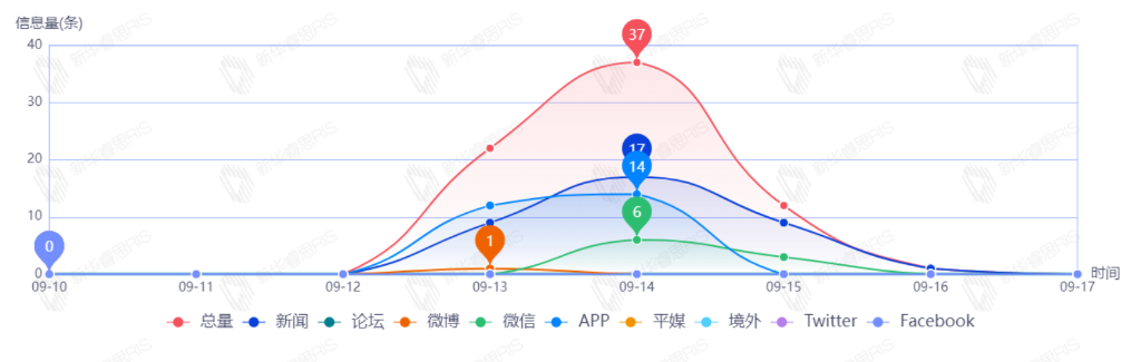 截至目前,該文章在互聯(lián)網(wǎng)上傳播總量72篇。其中9月14日是傳播的高峰期,共傳播37篇文章。各信源的信息發(fā)布情況中,新聞信息占比最大,其次是APP和微信,占比分別為50.00%、36.11%、12.50%。(數(shù)據(jù)來源:新華睿思數(shù)據(jù)云圖分析平臺)