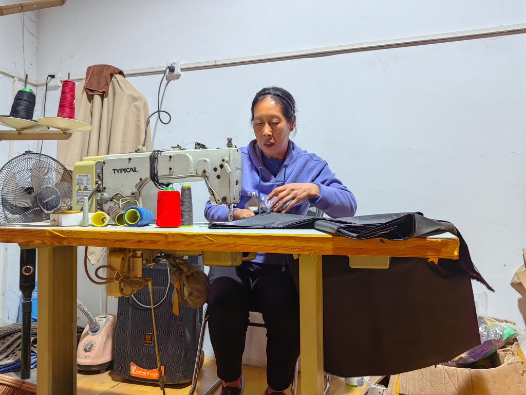王能香在缝纫机前缝补演员的演出服装。(新华社记者 马晓洁 摄)