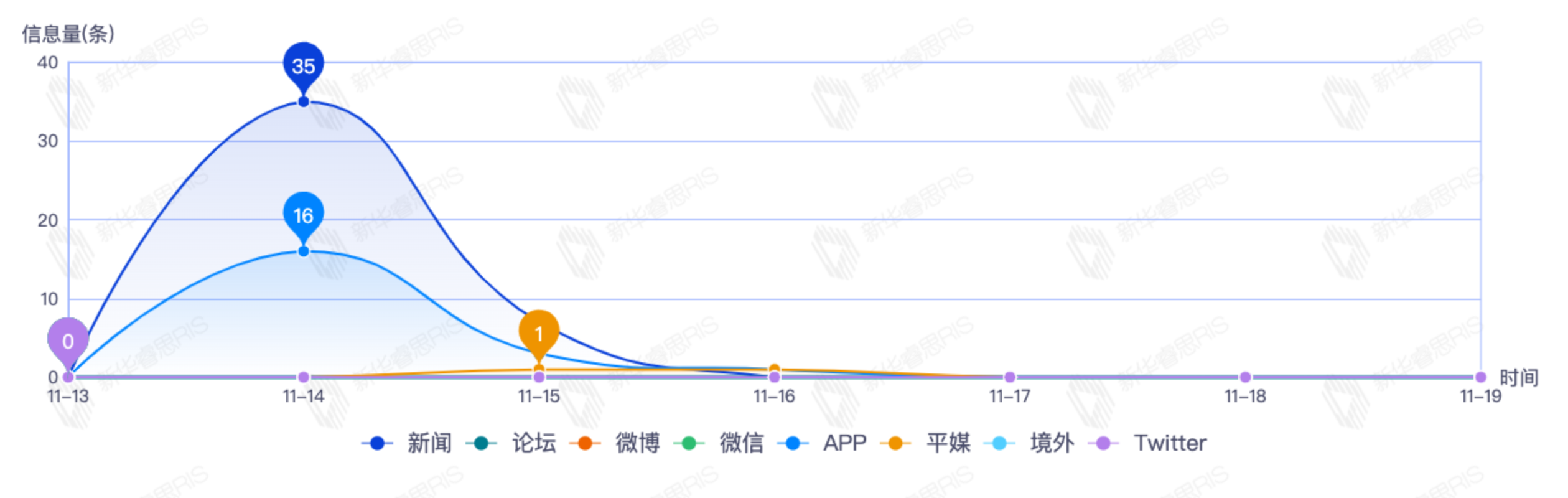 截至目前,該文章在互聯(lián)網(wǎng)上傳播總量共64篇。其中,11月14日是傳播的高峰期,共傳播35篇文章。各信源的信息發(fā)布情況中,其中新聞信息占比最大,其次是APP和平媒,信息量分別為37、20、2,占比分別為62.71%、33.90%、3.39%。(數(shù)據(jù)來源:新華睿思·數(shù)媒智慧分析平臺(tái))