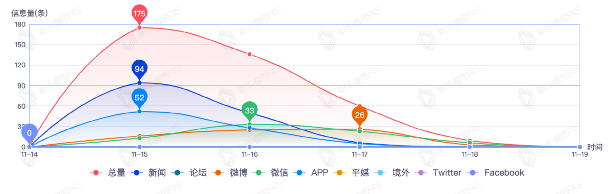 截至目前,該文章在互聯(lián)網(wǎng)上傳播總量共380篇。其中,11月15日是傳播的高峰期,共傳播175篇文章。各信源的信息發(fā)布情況中,新聞信息占比最大,其次是APP和微博,信息量分別為116、85、70,占比分別為34.52%、25.30%、20.83%。(數(shù)據(jù)來源:新華睿思·數(shù)媒智慧分析平臺(tái))