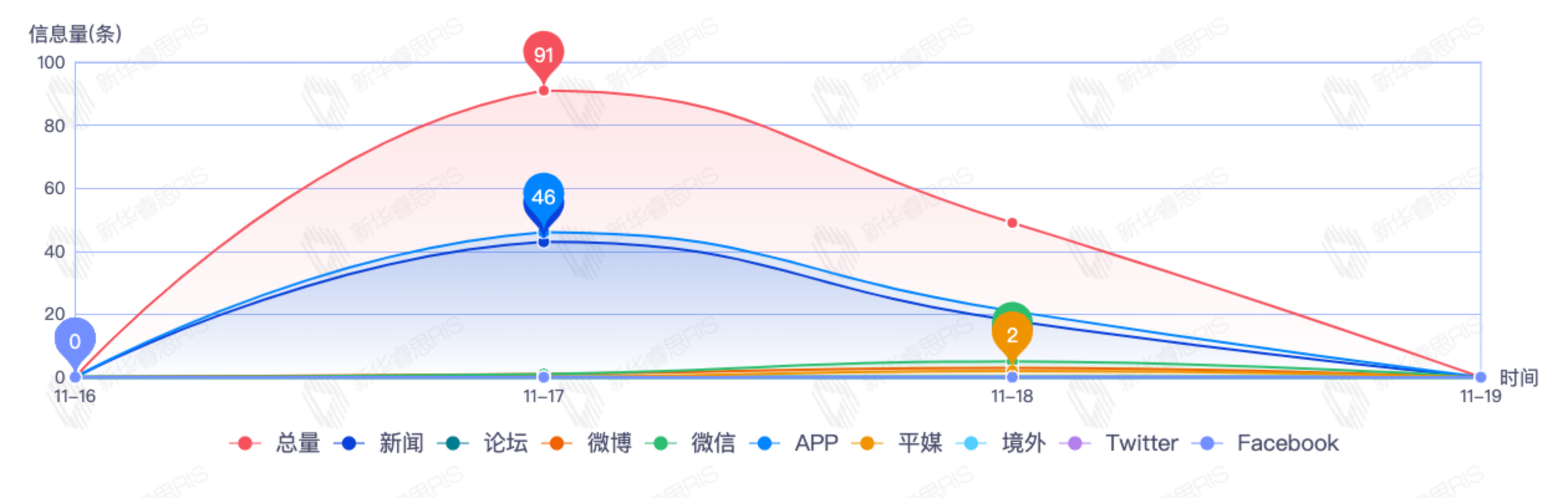 截至目前,該文章在互聯(lián)網(wǎng)上傳播總量共140篇。其中,11月17日是傳播的高峰期,共傳播91篇文章。各信源的信息發(fā)布情況中,其中APP信息占比最大,其次是新聞和微信,信息量分別為67、50、6,占比分別為51.94%、38.76%、4.65%。(數(shù)據(jù)來源:新華睿思·數(shù)媒智慧分析平臺(tái))