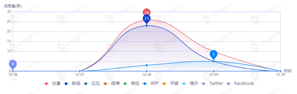 截至目前,該文章在互聯(lián)網(wǎng)上傳播總量36篇。其中12月28日是傳播的高峰期,共傳播26篇文章。各信源的信息發(fā)布情況中,新聞信息和APP占比最大,占比分別為73.33%和26.67%。(數(shù)據(jù)來源:新華睿思數(shù)據(jù)云圖分析平臺(tái))
