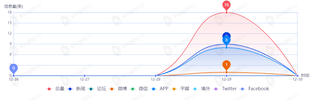 截至目前,該文章在互聯(lián)網(wǎng)上傳播總量18篇。其中12月28日是傳播的高峰期,共傳播18篇文章。各信源的信息發(fā)布情況中,新聞信息和APP占比最大,占比分別為47.06%和47.06%。(數(shù)據(jù)來源:新華睿思數(shù)據(jù)云圖分析平臺(tái))
